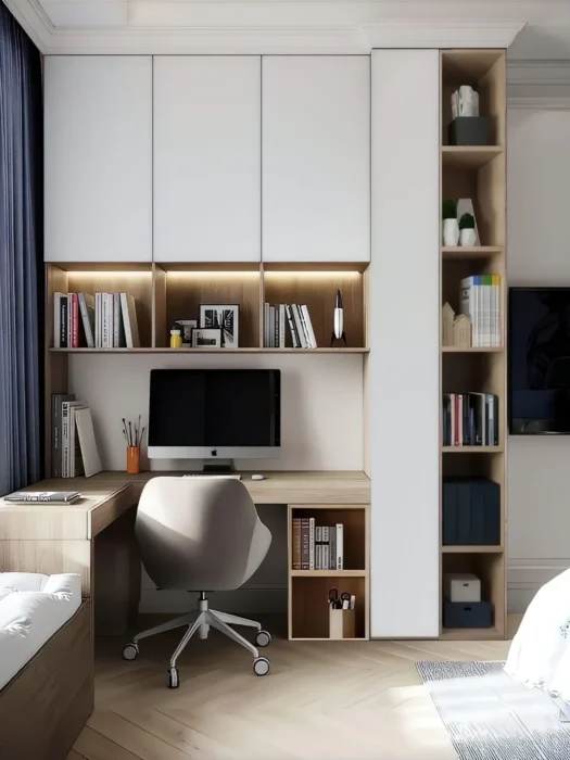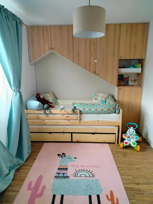 - Podpora samostatnosti: Vstavané skrine, nízke poličky a zásuvky prispôsobené výške dieťaťa ho prirodzene vedú k poriadku.