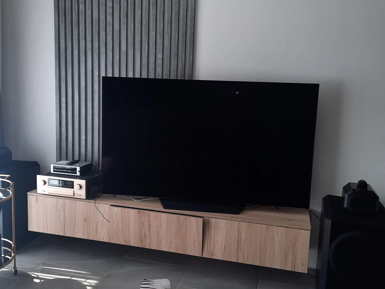 Televízor umiestnený na stene so zadným panelom a jemným LED osvetlením vytvorí v obývačke príjemnú kinonáladu.